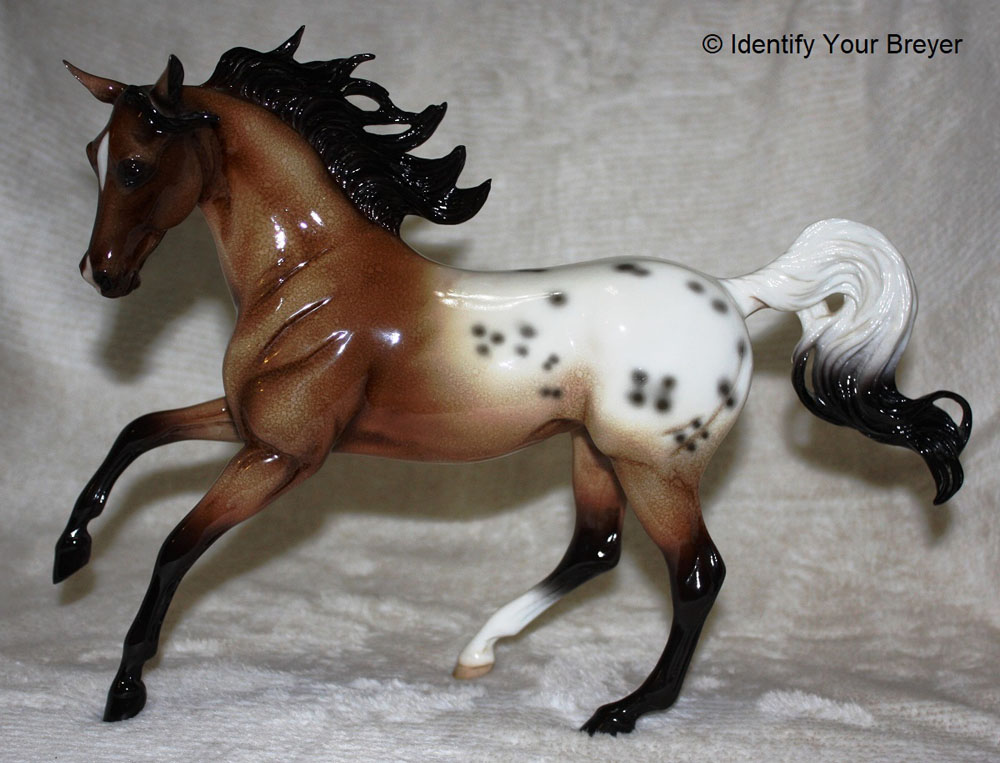 glossy black pinto, black and white mane, white tail with black tip, four high stockings | 2003 | BreyerFest Special Run (750 made) Sculpted by Kathleen Moody |